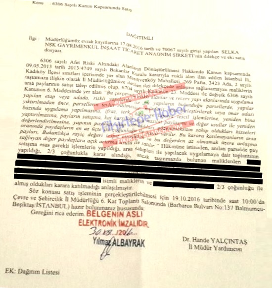Kadıköy - Fikirtepe Kentsel Dönüşüm bölgesinde Çevre ve Şehircilik Bakanlığı'ndan imza atmayan bazı parseller hakkında 6306 sayılı kanun kapsamında satış kararı verilerek bugün tarihi belirlenmişti. Bölgede faaliyette bulunan Mandarins A.Ş. ''Selka - Nsk'' inşaat'ın anlaşma yaptığı ve yüzde yüz imzası bitmeyen bir adasında 2/3 çoğunluğun sağlanamamasından dolayı henüz imza atmayan parseller hakkında yapılan resen tevhit sonrası bugün için Çevre ve Şehircilik Bakanlığı İstanbul İl Müdürlüğü binasında imza atan diğer paydaşlara satılması için karar alınmıştı. Alınan bu karar gereği sabah 10.00 da başlayan toplantı 6 saatten fazla sürdü...