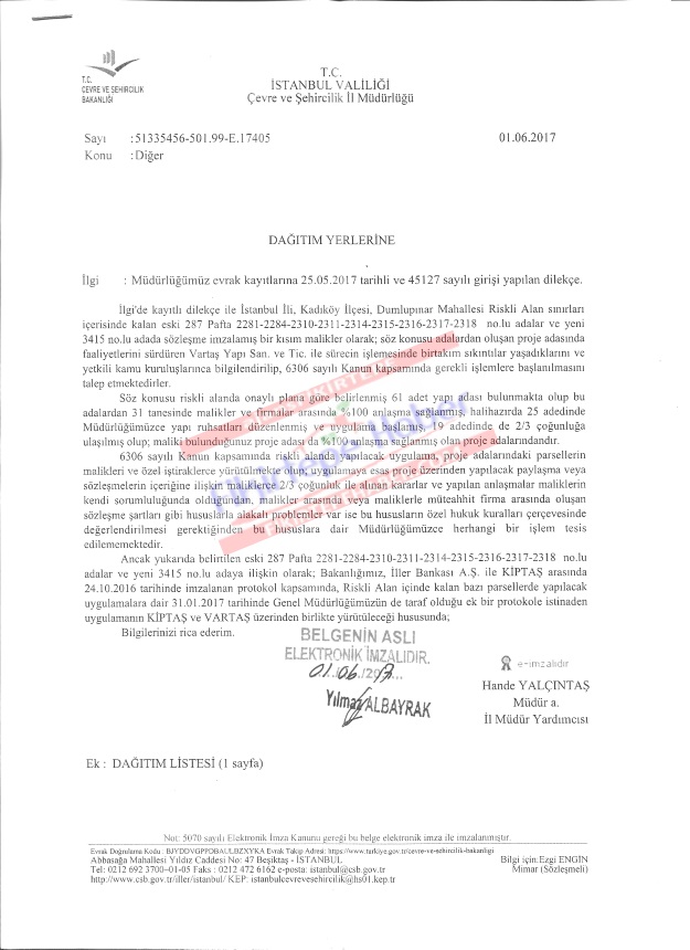 Ancak yukarıda belirtilen eski 287 Pafta 2281 - 2284 - 2310- 2311- 2314- 2315- 2316- 2317- 2318 Numaralı Adalar ve yeni 3415 Numaralı Adaya ilişkin olarak; Bakanlığımız, İller Bankası A.Ş. ile KİPTAŞ arasında 24.10.2016 tarihinde imzalanan protokol kapsamında, Riskli Alan içinde kalan bazı parsellerde yapılacak uygulamalara dair 31.01.2017 tarihinde Genel Müdürlüğümüzün de taraf olduğu ek bir protokole istinaden uygulamanın KİPTAŞ ve VARTAŞ üzerinden birlikte yürütüleceği hususunda ;